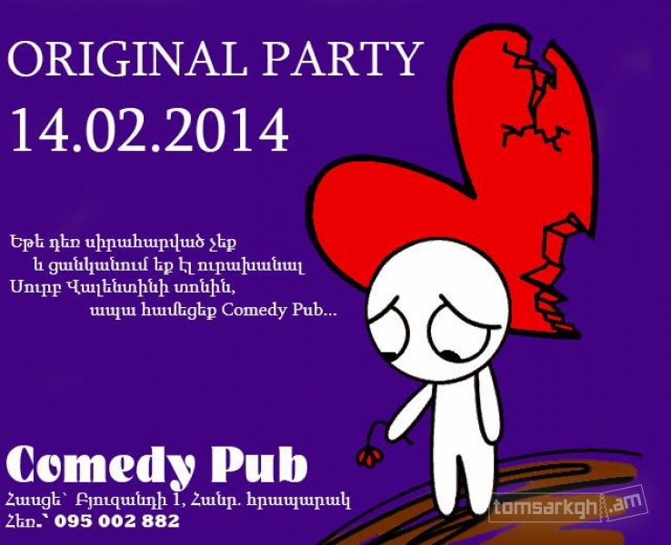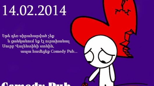 Comedy pub-ն այս անգամ ևս կգտնվի օրիգինալ և Սուրբ Վալենտինի օրը կնշի ոչ սովորական ձևով: Բոլոր նրանք, ովքեր դեռ սիրահարված չեն կամ այլևս սիրահարված չեն, կարող են գալ մեզ մոտ ուրախանալու: Սիրահարվածները նույնպես կարող են միանալ "չսիրահարվածներին":
