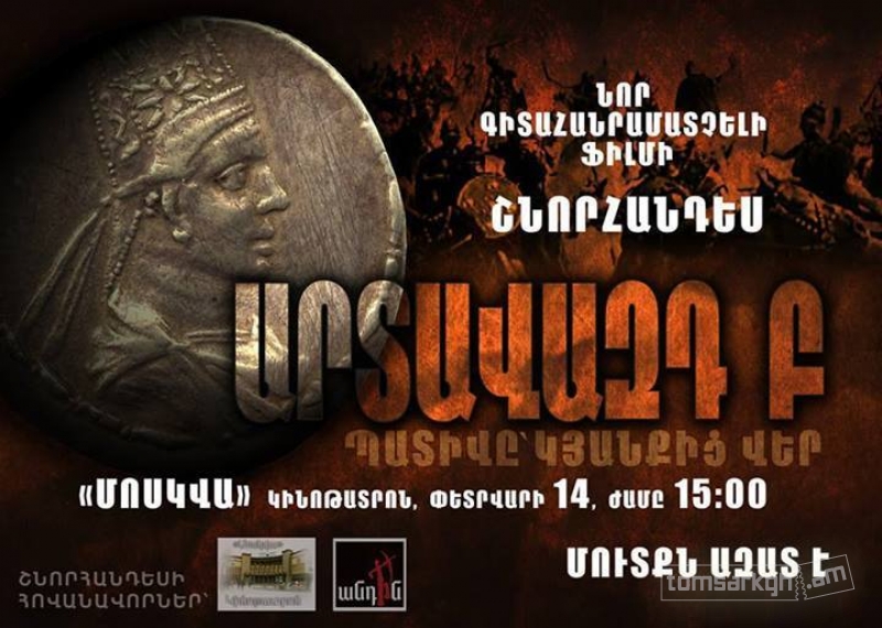 "Արտավազդ Բ. պատիվը՝ կյանքից վեր" նոր գիտահանրամատչելի ֆիլմի շնորհանդեսը տեղի կունենա փետրվարի 14-ին՝ ժամը 15:00, "Մոսկվա" կինոթատրոնում: Օրվա ընտրությունը պատահական չէ, քանի որ Արտավազդ Բ-Ն, աստվածացնելով ՝ նույնացվել է արևի աստծո հետ, մենք որոշեցինք շնորհանդեսը՝ կատարելով արևի տոնին՝ Տրնդեզին: