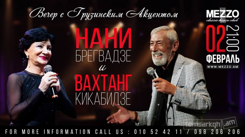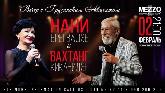 2-ого февраля Легенды Советской Эстрады Вахтанг Кикабидзе и Нани Брегвадзе выступят совместным концертом в клубе Меццо. Прозвучат всеми давно любимые и незабываемые хиты.