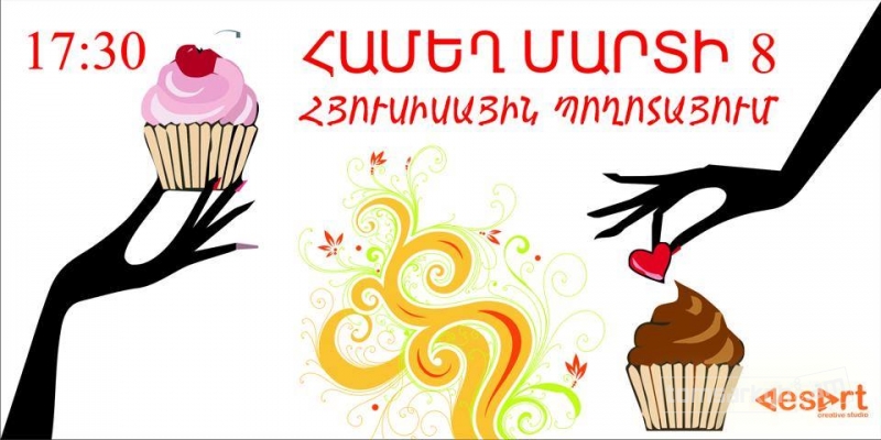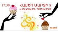 Desart studio-ն հրավիրում է բոլորին Հյուսիսային Պողոտա՝ ներկա գտնվելու " Համեղ մարտի 8" միջոցառմանը, որը կուղղորդվի զանազան անակնկալներով: Հյուսիսային Պողոտայի ոչ երթևեկելի հատվածում Ձեր օրն իսկական տոն կդարձնի անակնկալ շոուծրագիրն՝ իր առեղծվածային ելույթներով, մրցույթներն՝ իրենց աննման նվերներով, դե իսկ վերջում՝ " Դիզարտ"ստուդիոյի տնօրեն Հովհաննես Արիստակեսյանը կկտրի " ամեղ մարտի 8"տորթի առաջին կտորն ու կհյուրասիրի ներկա գտնվող ամենամեծ իգական սեռի ներկայացուցչին;