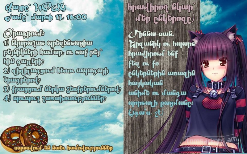 Մարտի 13-ին` ժամը 16:00-ին` Նորարական Փորձարարական Արվեստների կենտրոնում Առաջին հայերեն անիմե ու մանգա պորտալի բացումն է լինելու: Բաց չթողնեք: