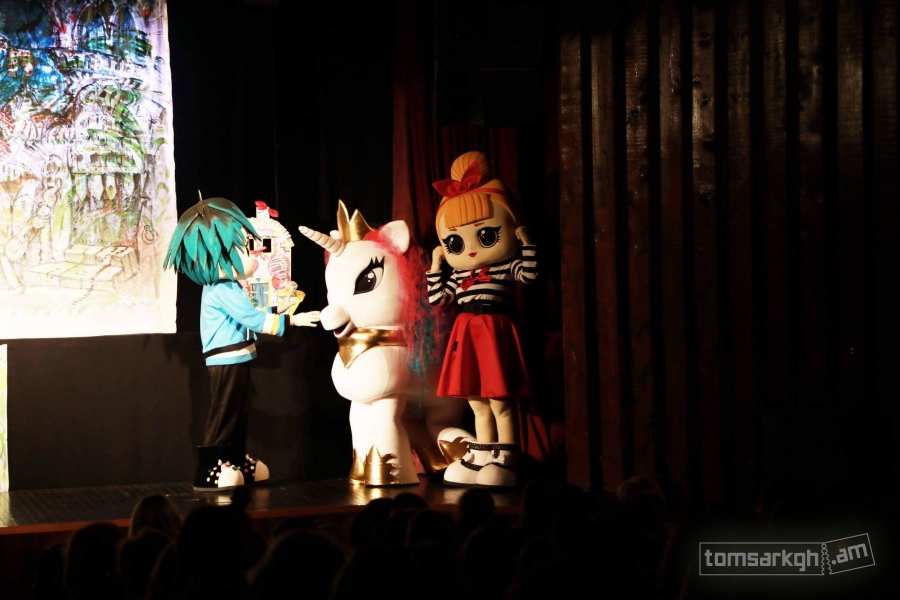 Զվարճալի մանկական ներկայացում երեխաների համար։ Ներկայացմանը մասնակցում են տիկնիկներ, կերպարներ, իրական կենդանիներ, ծաղրածու։