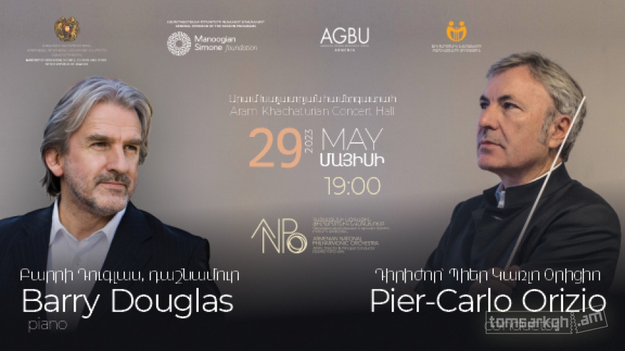 Անվանի իռլանդացի դաշնակահար Բարրի Դուգլասը հանդես կգա դիրիժոր Պիեր-Կառլո Օրիցիոյի ղեկավարությամբ: Ծրագրում. Մենդելսոն՝ «Հեբրիդներ» օպերայի նախերգանք Շուման՝ Դաշնամուրի կոնցերտ Շոստակովիչ՝ Սիմֆոնիա Aram Khachaturian Concert Hall Program Mendelssohn: “The Hebrides” overture Schumann: Piano Concerto Shostakovich: Symphony No.9 Pianist: Barry Douglas (Northern Ireland) Conductor: Pier-Carlo Orizio (Italy)