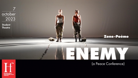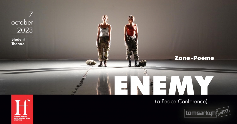 «Թշնամի» (խաղաղության կոնֆերանս) / Պարային պիես Եվրոպայում ռազմական հակամարտության տրավմայի մասին: Նկարագրություն: Ներկայացումը ստեղծված է հանուն խաղաղության և թշնամու կերպարը հարցականի տակ դնելու նպատակով։ Երկու պարողների խորեոգրաֆիկ բեմադրությունն առաջարկում է պարադոքսալ ուղի, որի միջոցով մարմինները, շնչառության միջոցով, գտնում են ձայնը, որպես միջոց կոնֆլիկտի տրավման դիմակայելու: «Մենք խնդրեցինք երկու ընկերների՝ ուկրաինուհի Էլվիրային և ռուս Սվետլանային հանդիպել և ձայնագրել իրենց խոսակցությունները: Այս վավերագրական աշխատանքը առաջարկում է ժամանակակից հայացք երկու պատերազմող երկրներին: Նրանց անձնական պատմությունները վկայում են շարունակվող հակամարտության անհեթեթության և սերտ կապերի մասին, որոնք միավորում են եվրոպական մայրցամաքի ժողովուրդներին։ Նրանց ձայնը խառնվելու է ՆԱՏՕ-ի զինվորների և նրանց ընտանիքների վկայություններին, որոնք տարբեր կերպ ներգրավված են այն ամենի մեջ, ինչ տեղի է ունենում ամեն օր սահմաններին և Եվրամիության սահմաններից դուրս»: ZONE - POÈME - (Լիլ, Ֆրանսիա) Ռեժիսոր՝ Մելոդի Լասելայն, Սայմոն Քեյփել Խորեոգրաֆիա՝ Մելոդի Լասելին համագործակցությամբ Լիա Պերայի հետ Նկարիչներ՝ Մելոդի Լասելին, Լեա Պերա Տևողությունը՝ 60ր