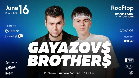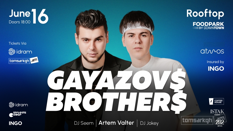 Gayazov$ Brother$ впервые выступят в Армении! Ждем тебя, чтобы вместе насладиться концертом под открытым небом, живым звуком и выступлениями специальных гостей – Artem Valter, DJ Jokey и DJ Seem.
