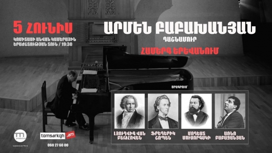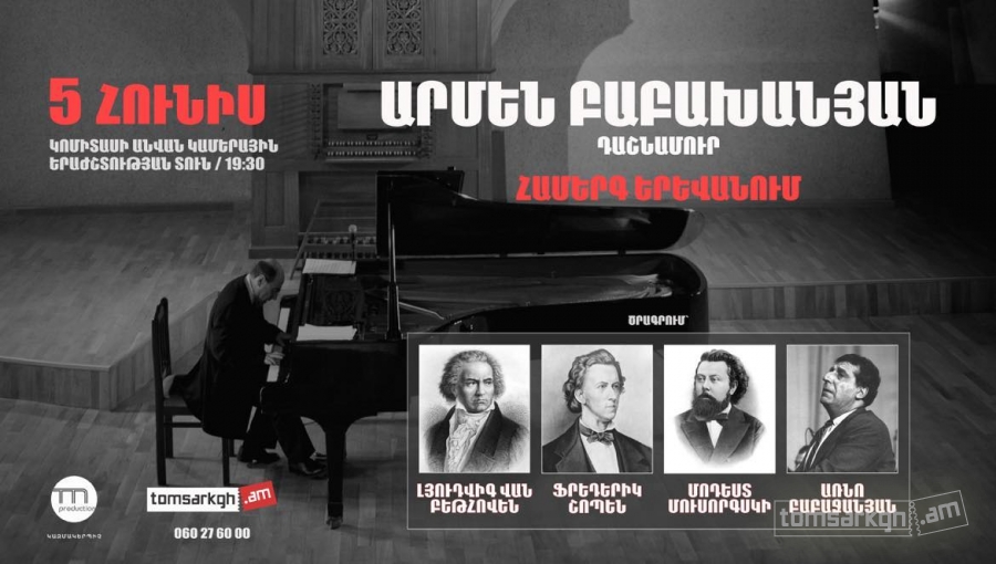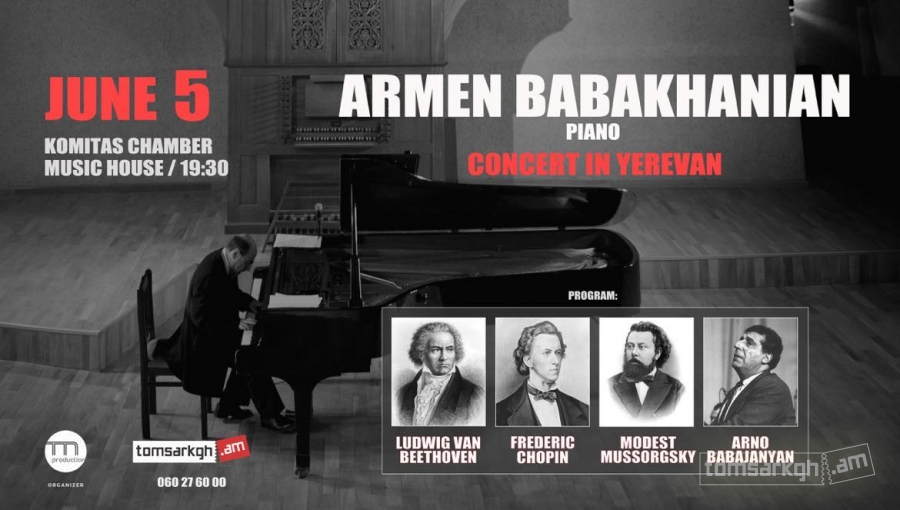 Հարգելի դասական երաժշտության երկրպագուներ, սիրով տեղեկացնում ենք, որ Հունիսի 5-ին Կոմիտասի անվան կամերային երաժշտության տանը երկար սպասված մենահամերգով ելույթ կունենա մի շարք միջազգային հեղինակավոր մրցույթների դափնեկիր, անվանի դաշնակահար Արմեն Բաբախանյանը: Ծրագրում ընդգրկված են հայ և արտասահմանյան կոմպոզիտորների ստեղծագործությունները:
