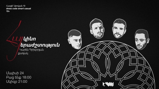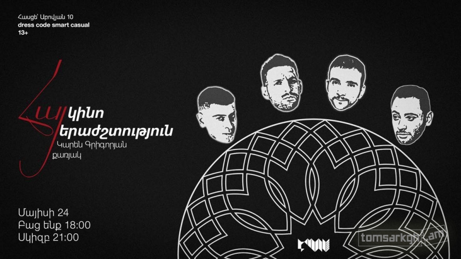 Հայ կինո երաժշտություն Կարեն Գրիգորյան քառյակ Մայիսի 24-ին հայ կինո երաժշտությունը նոր մատուցմամբ, նոր շնչով ԷՊՈՍ-ական միջավայրում։ ———— Աբովյան 10 | ԷՊՈՍ Մուտքավճար՝ 5000 դրամ։