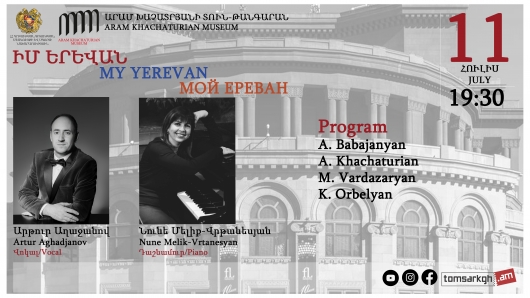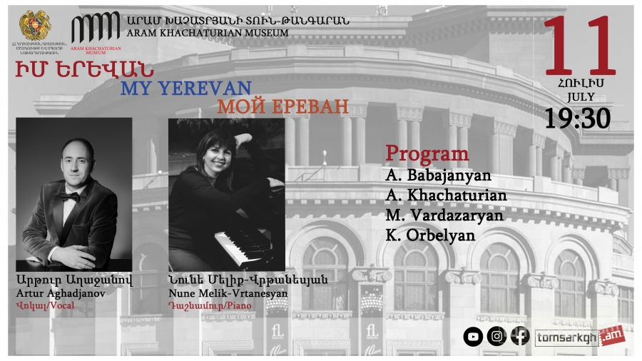 Հուլիսի 11-ին՝ ժամը 19:30-ին սիրով հրավիրում ենք Արամ Խաչատրյանի Տուն-թանգարանի գեղեցիկ համերգասրահ՝ վայելելու «Իմ Երևան» խորագիրը կրող ջերմ երաժշտական երեկոն: Երեկոյի ընթացքում սիրված երաժիշտների՝ Արթուր Աղաջանովի /վոկալ/ և միջազգային մրցույթի դափնեկիր, դաշնակահարուհի Նունե Մելիք-