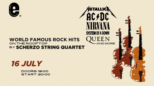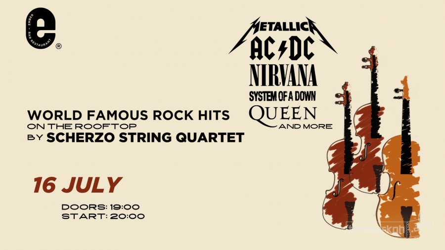 Ռոքի գլուխգործոցները տանիքում՝ սիմֆոնիկ քառյակի կատարմամբ: Աշխարհահռչակ ռոքի լեգենդար հիթերը կհնչեն ՝ Scherzostringsquartet լարային քառյակի կատարմամբ: Մի ամբողջ ռոմանտիկա մեկ համերգում՝ ամառ, տանիք, Հանրապետության հրապարակ, մայրամուտի տեսարան և անսահման ռոք երաժշտություն: