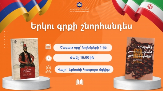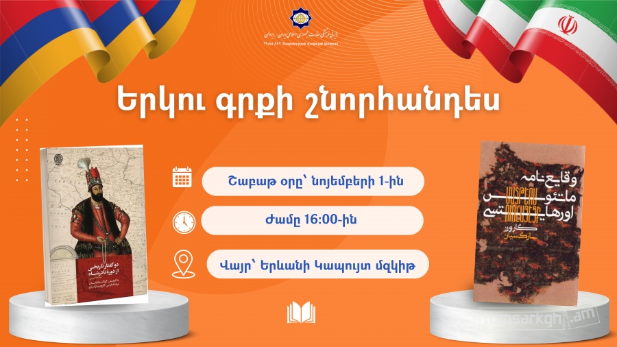 ԻԻՀ դեսպանության մշակույթի կենտրոնի կազմակերպությամբ շաբաթ օրը, նոյեմբերի 1-ին՝ ժամը 16։00-ին, Երևանի Կապույտ մզկիթում տեղի կունենա «Նադիր շահի ժամանակաշրջանի երկու պատմական վկայություն» (աշխատասիրությամբ՝ Արտակ Մաղալյանի) և «Մատթեոս Ուռհայեցու Ժամանակագրություն» գրքերի պարսկերեն թարգմանությունների շնորհանդեսը։