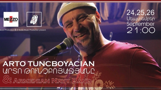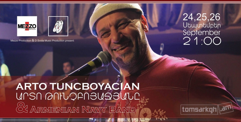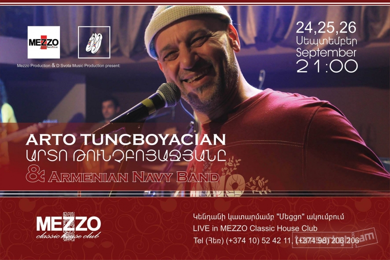 Mezzo production-ը և D Svota Music production-ը ներկայացնում են՝ սեպտեմբերի 24, 25 և 26-ին, ժ. 21:00, Արմենիան Նեյվի բենդը և Արտո Թունջբոյաջյանը կենդանի կատարմամբ «Մեցցո» ակումբում: Սիրով սպասում ենք Ձեզ «Մեցցո» -ում: