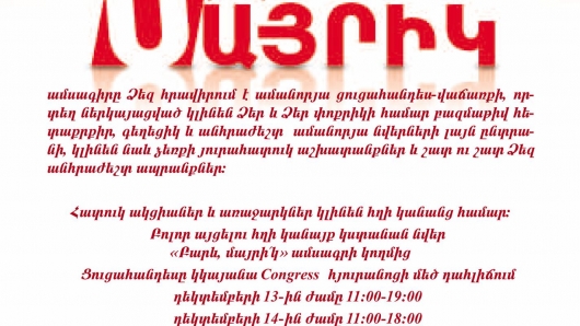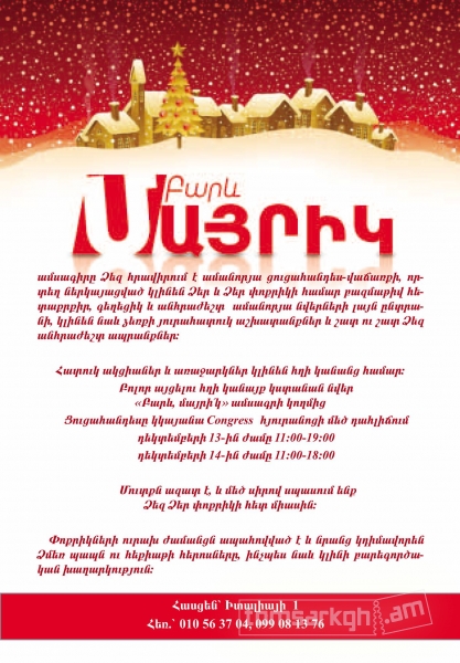 «Բարև, մայրիկ» ամսագիրը Ձեզ հրավիրում է ամանորյա ցուցահանդես-վաճառքի, որտեղ ներկայացված կլինեն Ձեր և Ձեր փոքրիկի համար բազմաթիվ հետաքրքիր, գեղեցիկ և անհրաժեշտ ամանորյա նվերների լայն ընտրանի, կլինեն նաև ձեռքի յուրահատուկ աշխատանքներ և շատ ու շատ Ձեզ անհրաժեշտ ապրանքներ: Հատուկ ակցիաներ և առաջարկներ կլինեն հղի կանանց համար: Բոլոր այցելու հղի կանայք կստանան նվեր «Բարև, մայրիկ» ամսագրի կողմից: